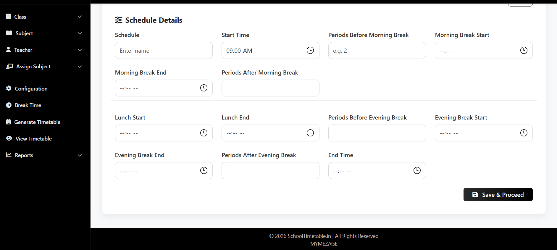 Use Timetable Form / Generate only after class, subject, teacher mapping, and break-time setup are fully completed. This module creates the timetable automatically based on your configured rules.