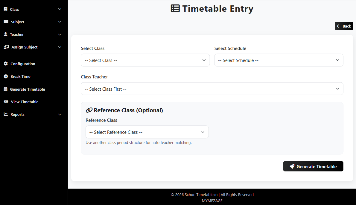 Use Timetable Form / Generate only after class, subject, teacher mapping, and break-time setup are fully completed. This module creates the timetable automatically based on your configured rules.