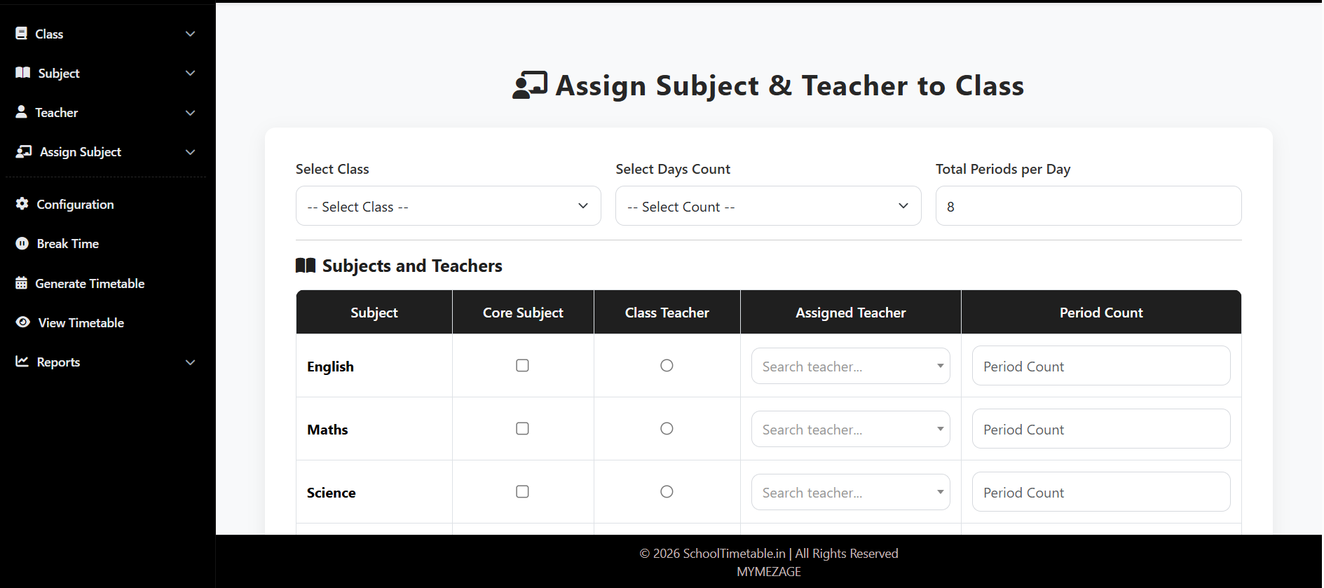 This is the most important step for automatic timetable generation. In this screen, each class gets its subject, teacher, and weekly period mapping. Wrong or incomplete mapping can cause generation failure or invalid timetable.