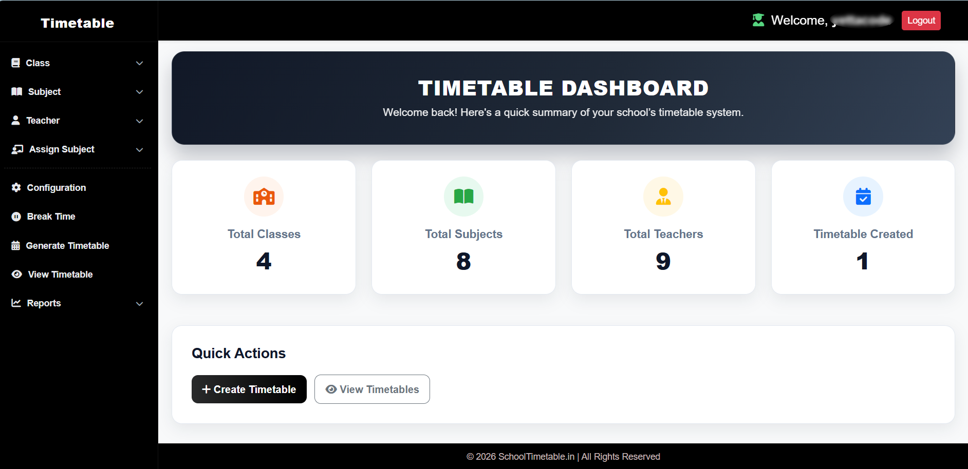 After login, the dashboard is your control panel for all daily timetable work. At the top, you can quickly see summary cards such as total classes, total subjects, total teachers, and generated timetables. These numbers help you confirm whether initial setup is complete before generation.