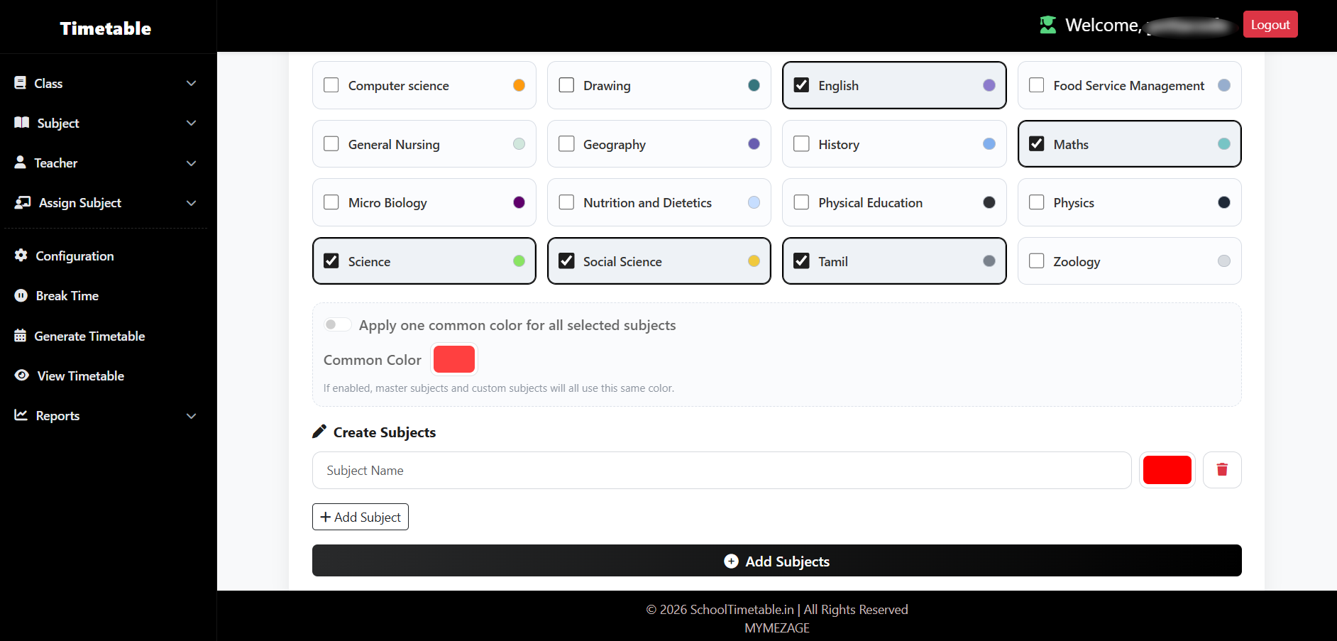 In Subject Select, add all subjects that will be used in timetable generation for each class. Subject names must be clean and non-duplicate, because the same subjects are reused later in teacher assignment.