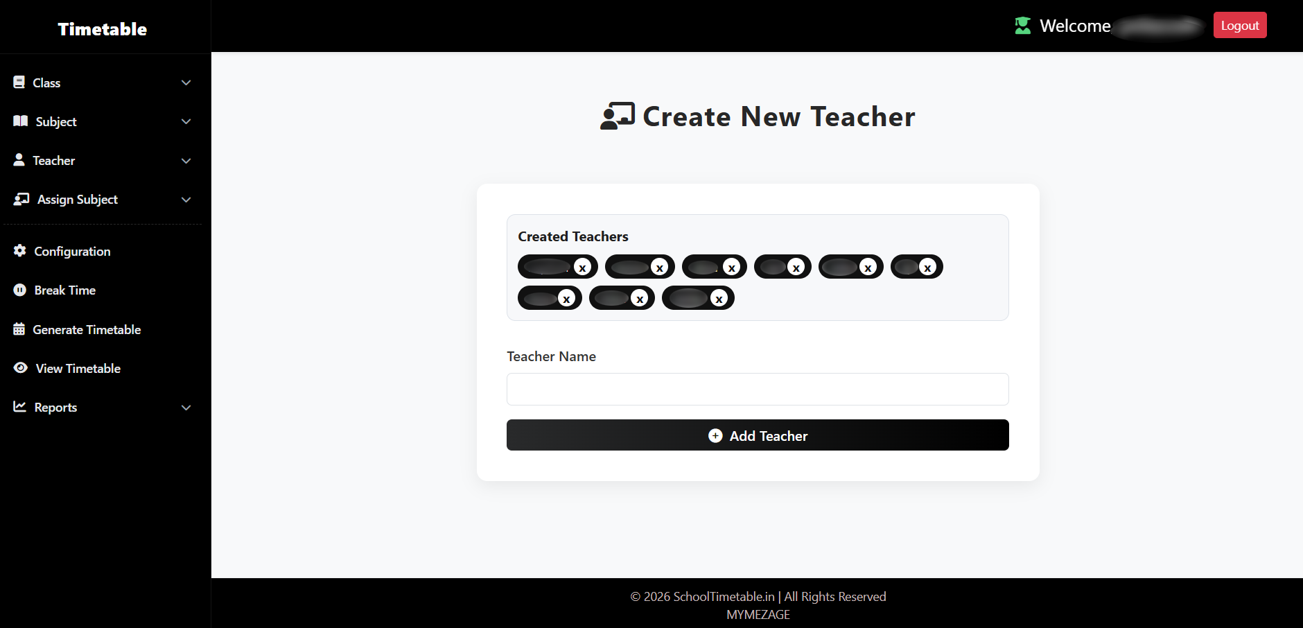 In Teacher Create, add all teaching staff before assigning subjects. Teacher names entered here will be used directly in timetable generation, so accuracy and duplicate control are very important.
